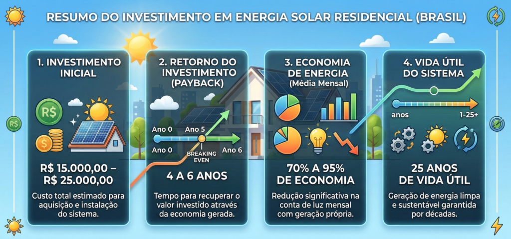 O payback médio é de 4-6 anos no Brasil. Exemplo: investimento de R$ 20.000 com economia de R$ 400/mês = payback de 4,2 anos. Após esse período, você lucra durante 20+ anos. Retorno total em 25 anos pode ser R$ 80.000-120.000, representando ROI de 400-600%.